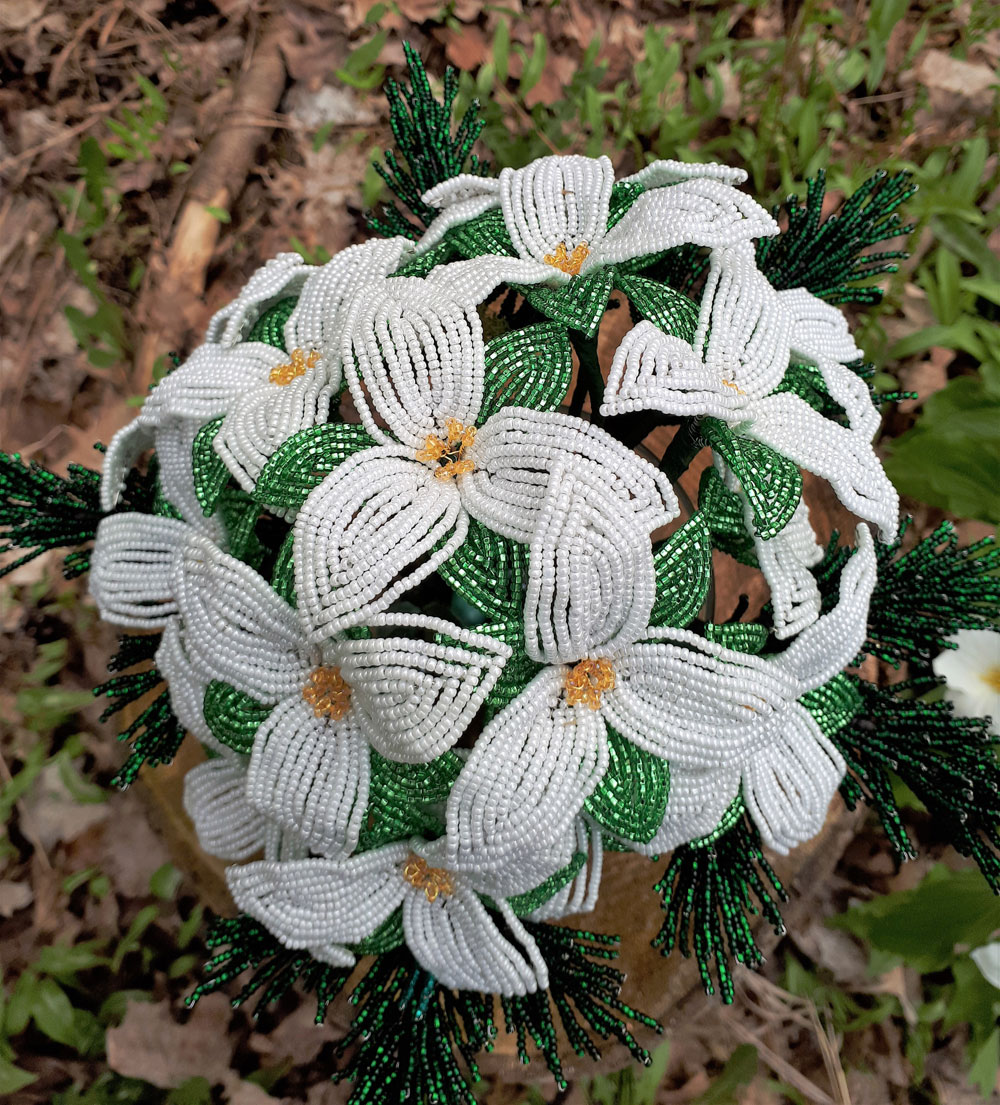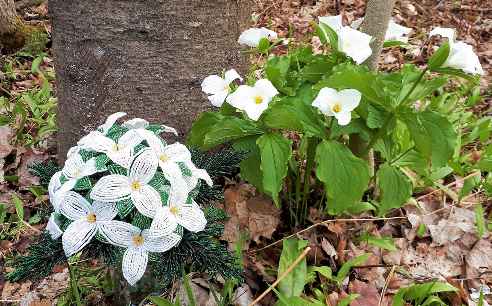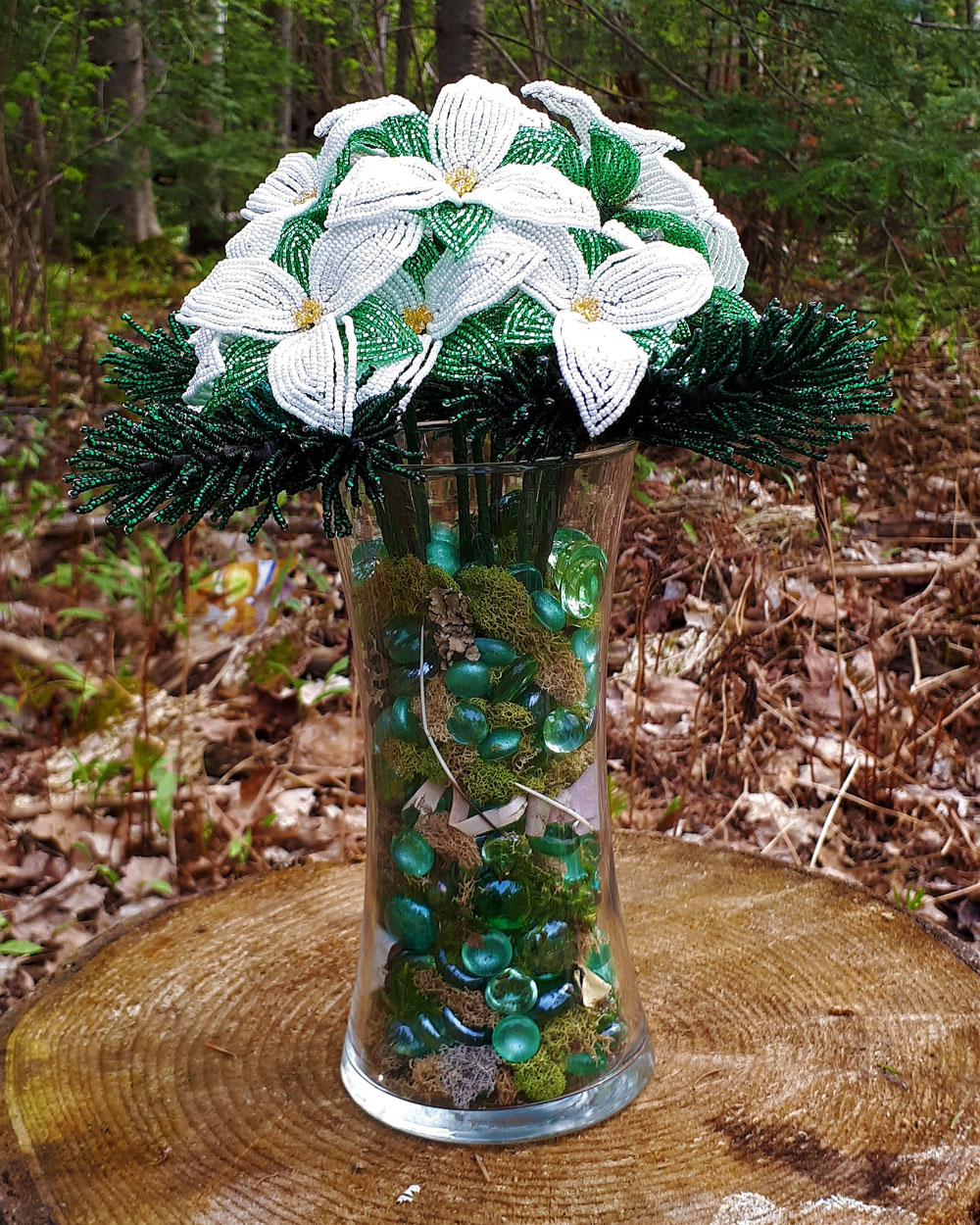 Sometimes I’ll create pieces following a specific theme. For example “Northern Pride”, the bouquet of pine boughs and trilliums pictured below, appeared at the NOVAH gallery in North Bay, Ontario (July 2018). This was my first gallery appearance! The theme of the show was “Our Northern Landscape”. The inspiration for this piece came from my property. We have a wooded lot, and we’re fortunate to have plenty of trilliums.
